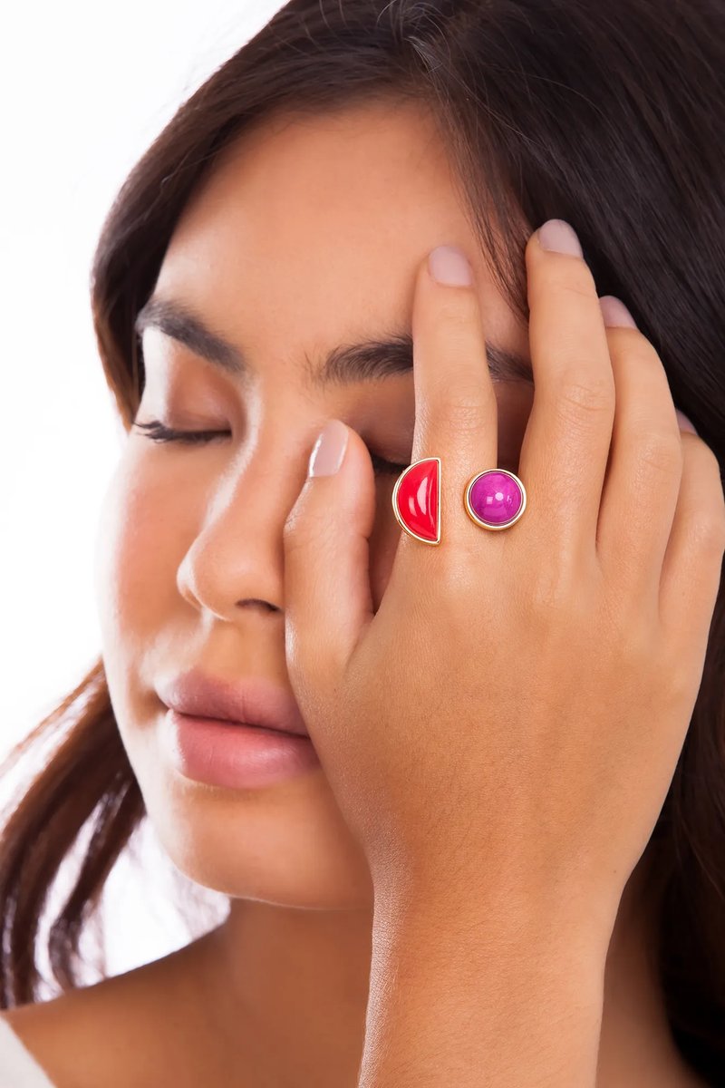O Anel Brisa Maria Dolores, um dos ícones da marca, é um anel médio e delicado, perfeito para criar combinações com peças de diferentes coleções. O anel possui um aro fino e aberto, o que possibilita o ajuste e encaixe em vários dedos. A peça possui detalhe superior composto por pedra natural Haulita Pink em formato redondo com lapidação facetada de um lado e do outro um semicírculo em resina Vermelha. Uma peça delicada, atemporal, que transforma os looks com estilo e delicadeza com as suas cores e o seu design leve e feminino.