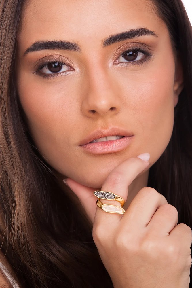 O Anel Clareza Maria Dolores é um anel pequeno folheado a Ouro que traduz a delicadeza e a sofisticação do design autoral. Com aro aberto, ele se ajusta facilmente aos dedos, enquanto o detalhe superior equilibra contraste e harmonia: de um lado, a pedra natural Cristal com facetamento irregular, lapidação desenhada, assinatura do DNA Maria Dolores. Do outro, uma Drusa Metalizada com formas orgânicas. Uma peça atemporal e minimalista, perfeita para valorizar qualquer styling e adicionar um toque de glamour sutil. Uma peça que expressa exatamente a essência da Coleção Existe em mim, já que toda joia já foi esboço. Todo esboço fluiu de uma ideia. Toda ideia nasceu de um sentimento. Todo sentimento já transbordou de alguém. Somos fragmentos de emoções vividas, assim como a coleção Existe em Mim. Seu design resgata nossa jornada intensa. É repertório da nossa existência. Encontro com nossa totalidade. São novas joias que se originam do passado, com materiais e lapidações que ecoam nossa essência e escoam uma história viva e cheia de energia. Que em algum momento, passou a Existir em Mim. Maria Dolores apresenta: Existe em mim