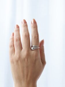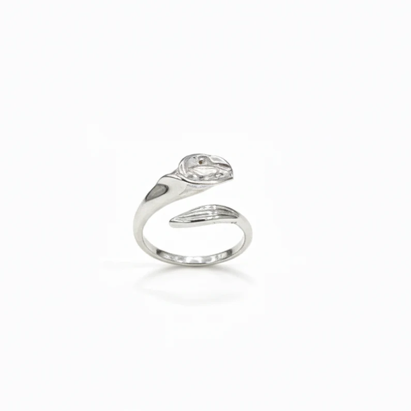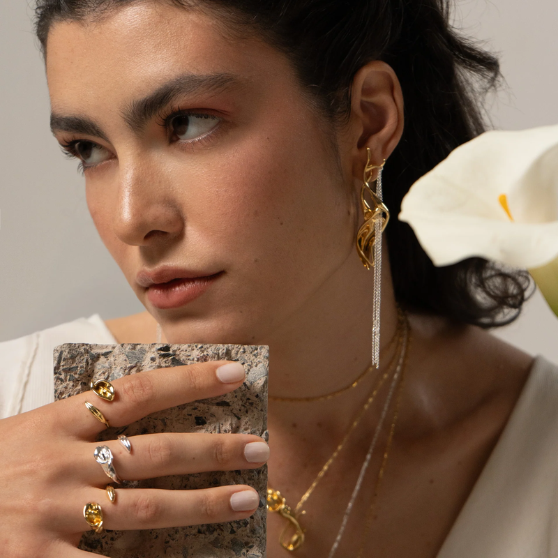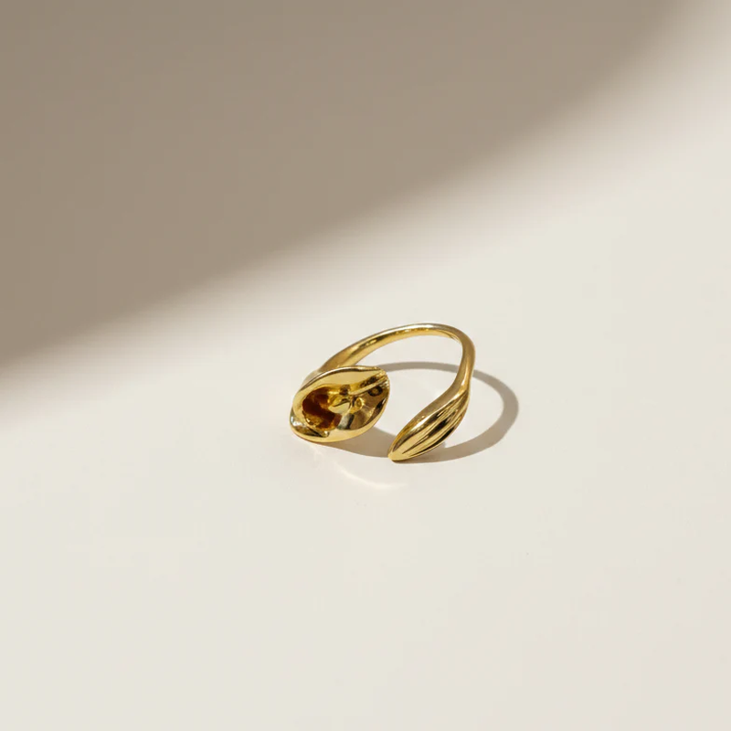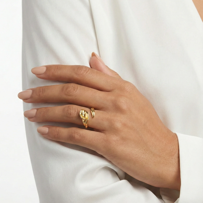 Seu formato aberto cria um equilíbrio delicado entre presença e suavidade, enquanto o acabamento polido realça as linhas orgânicas da peça, refletindo a luz de maneira limpa e elegante. Um anel que não pesa, não compete, apenas acompanha.