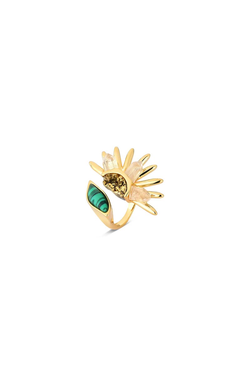 O Anel Girassol Maria Dolores traduz a energia luminosa do sol em uma joia icônica. Folheado a Ouro, o modelo apresenta um aro aberto com design escultural que se desdobra em dois lados: de um, o meio girassol em metal com pétalas delicadas e pontas em pedra natural Cristal; do outro, uma folha em pedra Malaquita que equilibra o conjunto com cor e presença. No centro da flor, a Drusa Cobre garante o brilho intenso que é marca registrada da coleção.A peça, um ícone Maria Dolores, volta agora em versão menor, preservando o impacto visual e o significado da original, mas com proporções mais leves e confortáveis para o uso diário.Mais do que uma joia, o Anel Girassol é um amuleto de boas energias, inspirado na flor que simboliza vitalidade, felicidade e renovação. Um design radiante que revela o lado mais iluminado de quem o veste.