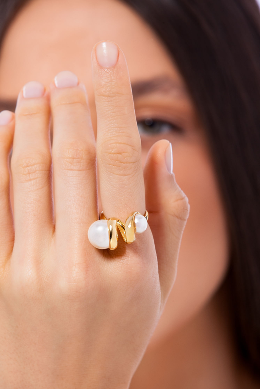 Assim como o Anel Mudança Maria Dolores, um anel médio, folheado a Ouro, com aro fino e detalhe superior em metal, com um design orgânico de espiral que envolve duas esferas de Pérola. Um anel que representa literalmente o conceito da coleção “O mundo dá voltas”, traduzido pela ideia da pedra esférica.