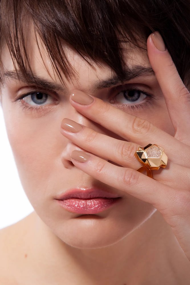 Com volume marcante e acabamento facetado, o Anel Shibui Maria Dolores é uma peça statement que une força e sofisticação. O topo elevado traz a estética das dobraduras com impacto escultural, enquanto a Drusa Metalizada central adiciona brilho e profundidade ao visual. Seu aro duplo traz conforto no uso e reflete a identidade da coleção nos detalhes: superfícies anguladas, formas ousadas e leveza no vestir. Um anel médio folheado a Ouro que veste como uma escultura contemporânea, mas com ergonomia perfeita para o dia a dia. Ideal para quem valoriza joias que se destacam pelos detalhes e trazem significado em cada traço do design.