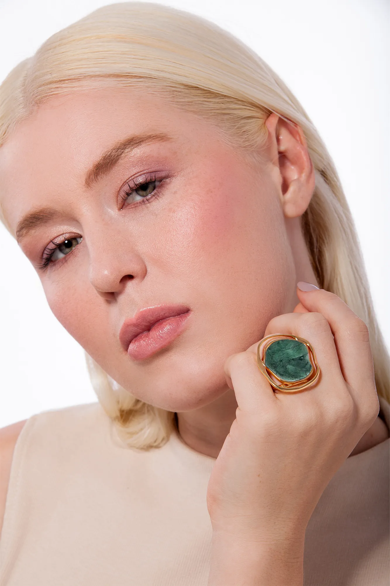 O Anel Soleil Maria Dolores é um maxi anel, folheado a ouro ou ródio negro, composto por uma pedra natural Ágata Azul em formato orgânico envolta por metal. Uma peça clássica e sofisticada, que por ter em sua composição uma pedra totalmente natural, suas mesclas de cores tornam cada anel único, conferindo um look supercharmoso.