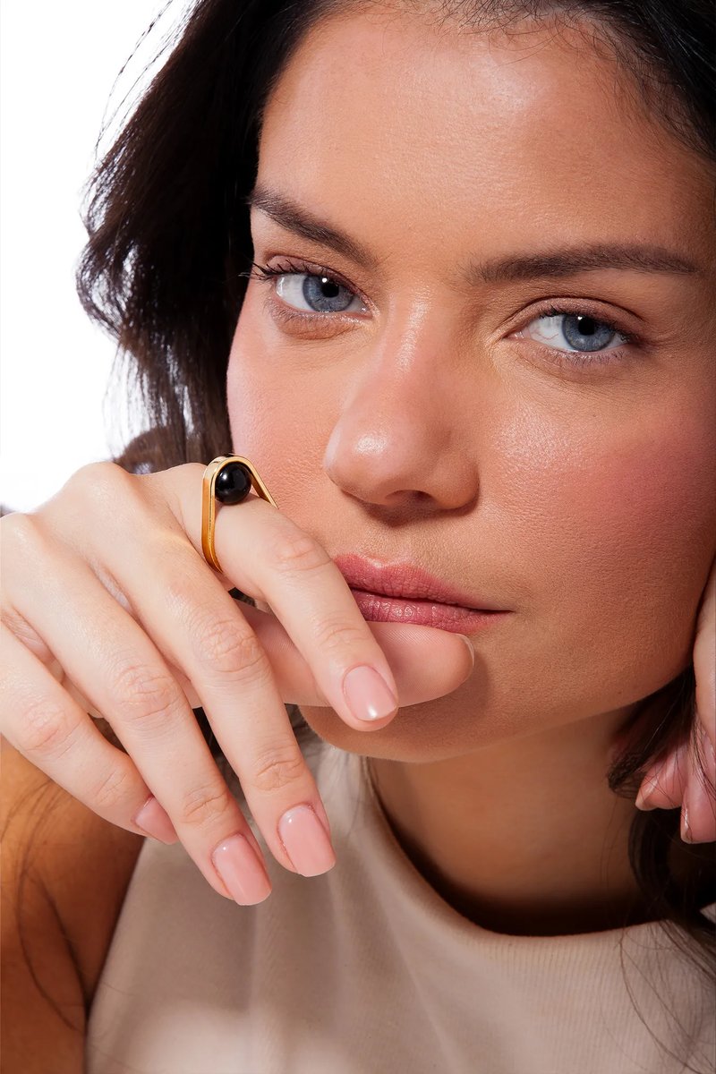 O Anel Sorriso Maria Dolores é a combinação perfeita de delicadeza e contemporaneidade. Um anel delicado com aro de metal folheado a Ouro com aro orgânico que envolve uma esfera de pedra Obsidiana Preta, criando um efeito sutil e elegante. O desenho contorna naturalmente a pedra, criando o efeito elevado no centro, garantindo conforto ao vestir e uma estética sofisticada. Minimalista e elegante, é a peça que une leveza e personalidade, perfeita para quem busca um detalhe discreto, mas cheio de estilo.