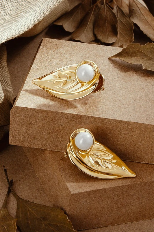 Banhado a ouro 18K, possui folha estilizada e pérola que oferece brilho suave. Tarraxas seguras e feitura hipoalergênica garantem conforto prolongado.