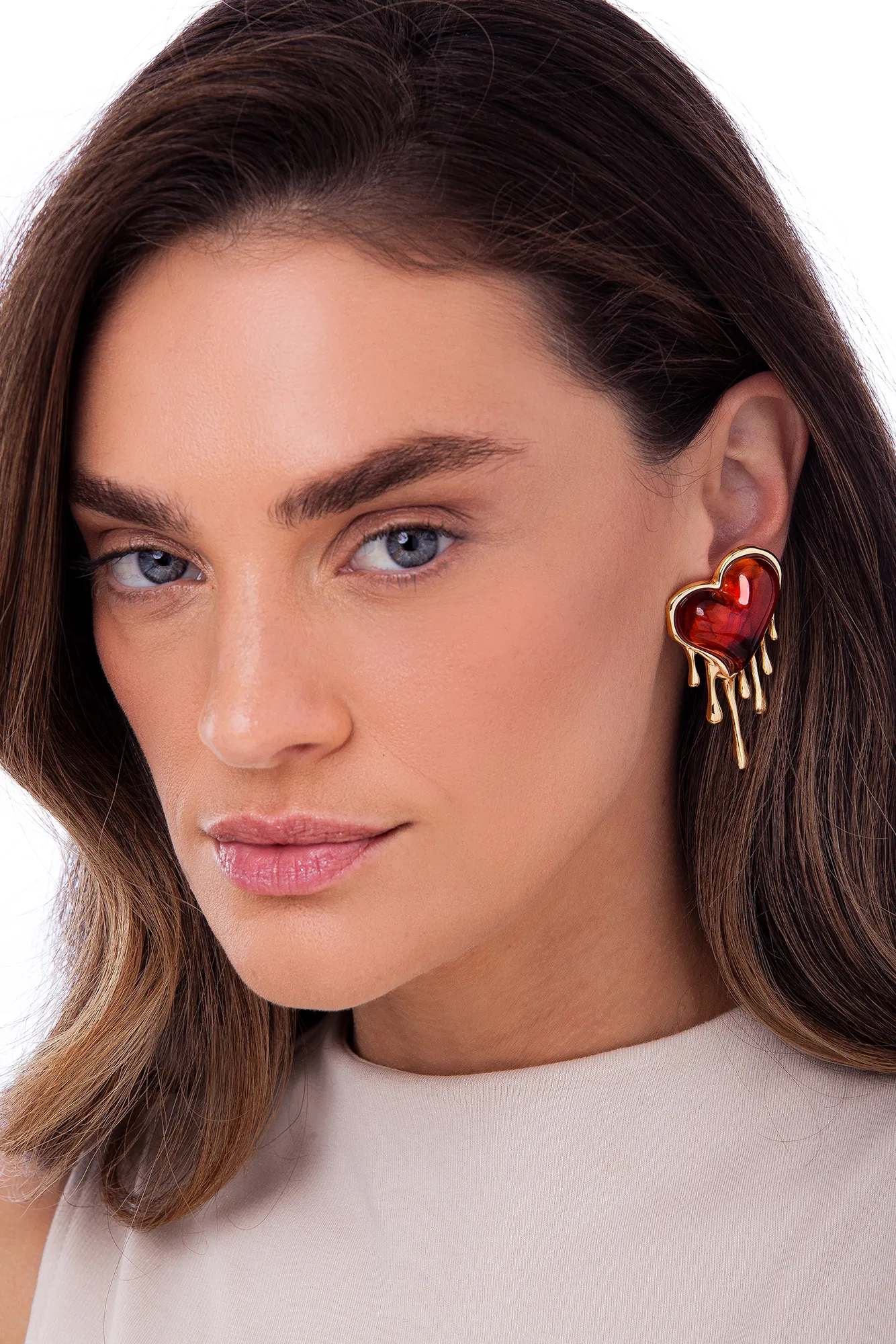 O Brinco Paixão Maria Dolores é um maxi brinco, em metal folheado a Ouro, com formato figurativo de coração e composição de resina Caramelo com detalhe em metal com aspecto derretido. Uma peça statement para quem gosta de compor looks com personalidade e fugir do óbvio quando o assunto é estilo. A Coleção Impulso Maria Dolores é pura emoção. Dá forma a experiências. Entrega-se ao movimento da vida. A coleção possui três famílias pensadas a partir de um mesmo conceito: As emoções e como elas se manifestam. O Brinco Paixão faz parte da família Paixão, que simboliza este sentimento e o desejo, em um furor de pedras, metais e sensibilidade.