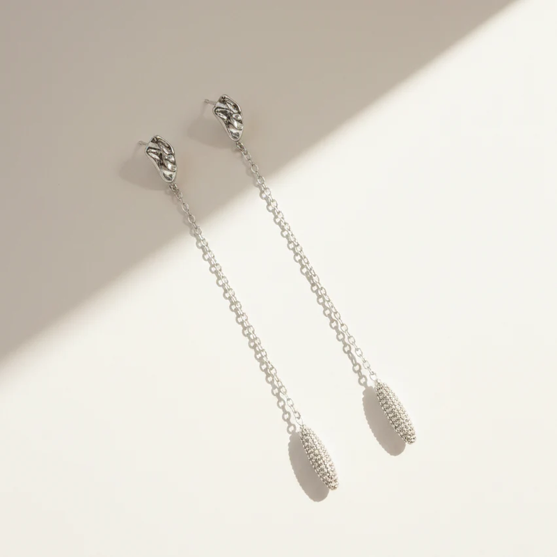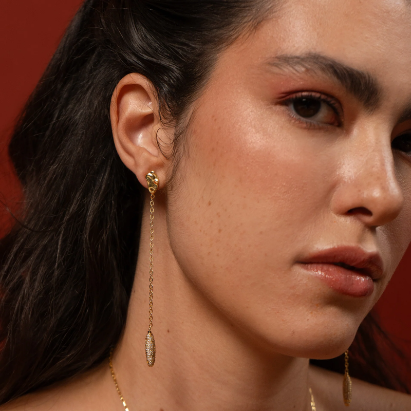 O Brinco Sopro Pêndulo Cravejado é uma peça longa, fluida e surpreendentemente leve. Seu movimento delicado acompanha o corpo com naturalidade, criando um efeito sutil e contínuo, como um sopro que nunca se interrompe.