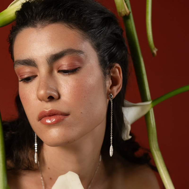 Na extremidade da corrente, o pistilo da flor copo-de-leite surge inteiramente cravejado com cristais de zircônia, trazendo brilho pontual e refinado. A base do brinco possui design orgânico e leve, equilibrando a composição e valorizando o caimento da peça.