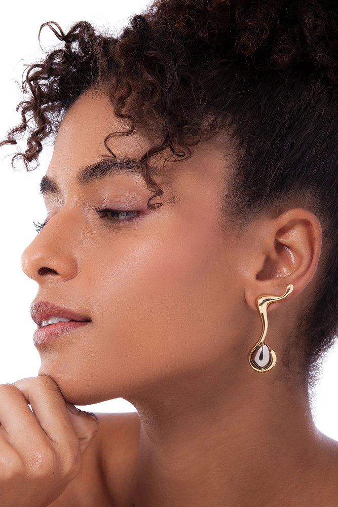 O Brinco Traço Maria Dolores é um brinco longo com pedra natural que une elegância e fluidez em cada detalhe. Folheado a Ouro, ele se acomoda delicadamente à orelha com uma haste que acompanha o lóbulo em desenho elegante, subindo em diagonal antes de descer suavemente até envolver a pedra Haulita Turquesa. A lapidação cabochão da pedra destaca um ponto de cor marcante, envolvido por um metal de volume orgânico e acabamento polido. Com estrutura alongada e leveza ao vestir, é uma joia que traz sofisticação e um contraste visual encantador, perfeita para compor produções com personalidade e valorizar a beleza dos detalhes.