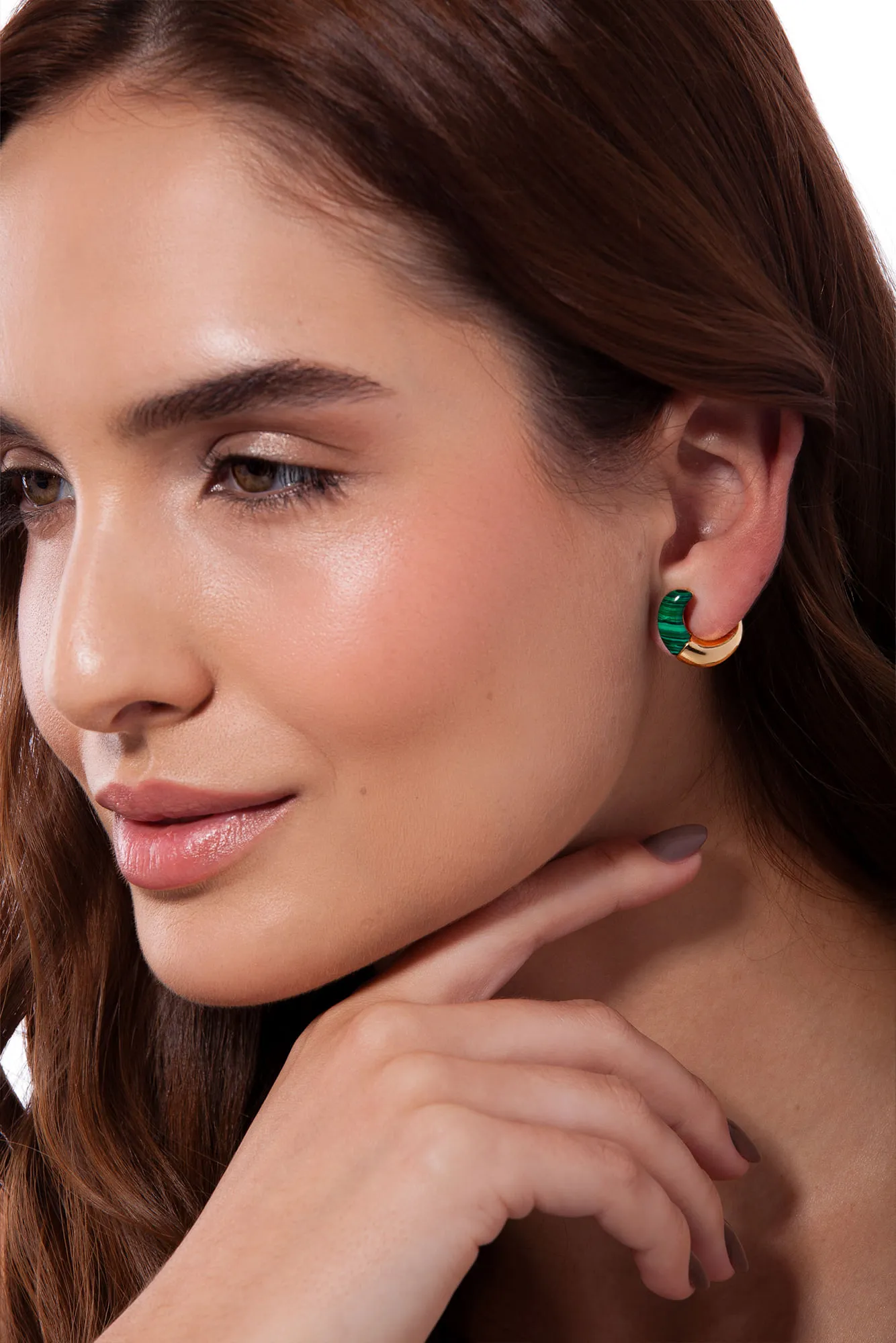 A arte é um traje essencial. Roupagem com linguagem universal, De potência, leveza e poesia. Uma segunda pele, um tecido vital. Que recobre de sentido à existência. Nos conecta com seus fios sensíveis, Que conduzem beleza em meio ao caos. A arte nos veste, reveste os pensamentos. Nos abraça com uma explosão de cores e texturas, Em uma jornada de formas e movimentos surreais. A arte nos conduz a caminhos inesperados. É um véu que nos cobre, enquanto nos revela. E abre passagem para sonhar e transformar. Nova coleção TRAJEtos Maria Dolores – Arte que me veste. E o Brinco Vínculo P Maria Dolores é uma forma de apresentar isso, trazendo todos esses caminhos como se fosse uma jornada, uma rota criativa, artística, fazendo esse enlace, esse envolvimento do metal na orelha. Como uma curva de metal que envolve o lóbulo da orelha, versátil e moderno, o brinco traz uma pedra Malaquita e o metal que enlaça e continua o seu trajeto atrás da orelha. Uma peça pequena e delicada, porém com uma presença gigantesca.