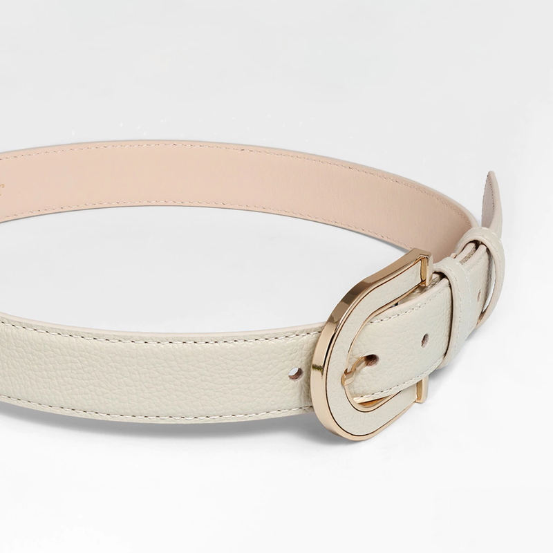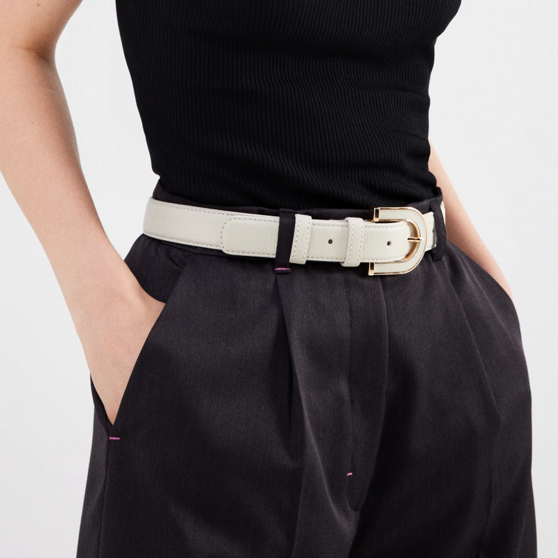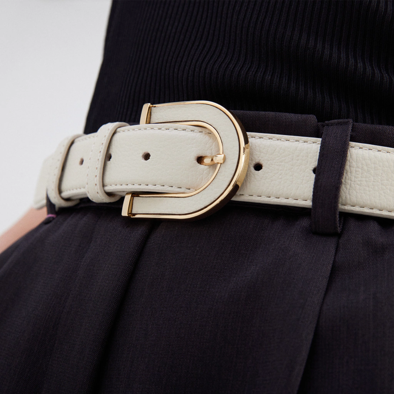 Dois passantes, sendo um fixo e outro móvel, possibilitando também usar o cinto por cima de vestidos, blazers e casacos.