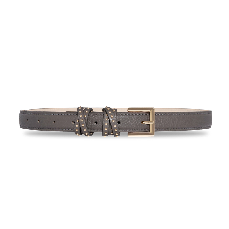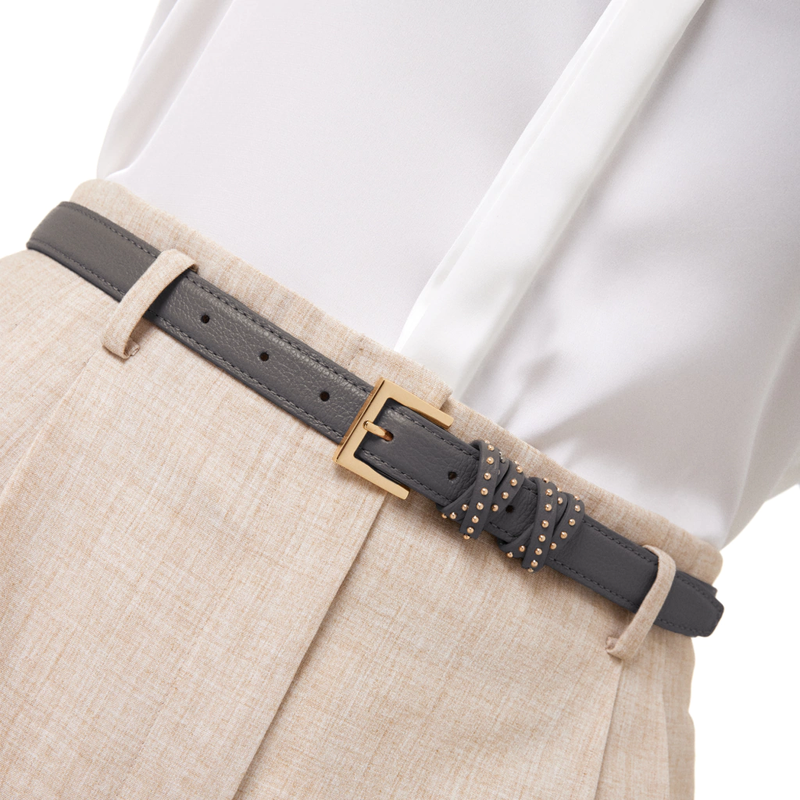 O Cinto Iris é um modelo estreito e se destaca pelos seus passantes entrelaçados, apresentando um detalhe sutil: tachas que realçam a modernidade do design.