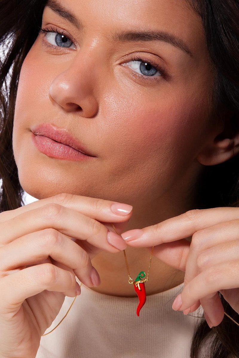 O Colar Picante Maria Dolores é um escapulário folheado a Ouro que une delicadeza, versatilidade e significado. Em uma das extremidades, o trevo de quatro folhas traz um coração em pedra natural Quartzo Verde, símbolo de amor e sorte. Na outra, a pimenta em Resina Vermelha com detalhe esmaltado em Verde, produzido através da técnica de pintura à mão, representa proteção e energia vibrante. A corrente Veneziana com fecho discreto permite diferentes formas de uso: em versão longa, destacando apenas um dos pingentes, ou em duas voltas, com ambos os símbolos à frente. Um design inteligente que se adapta ao styling e multiplica as possibilidades de composição. Uma joia leve e contemporânea, pensada para carregar os amuletos mais marcantes da coleção Dolce Tropicália.