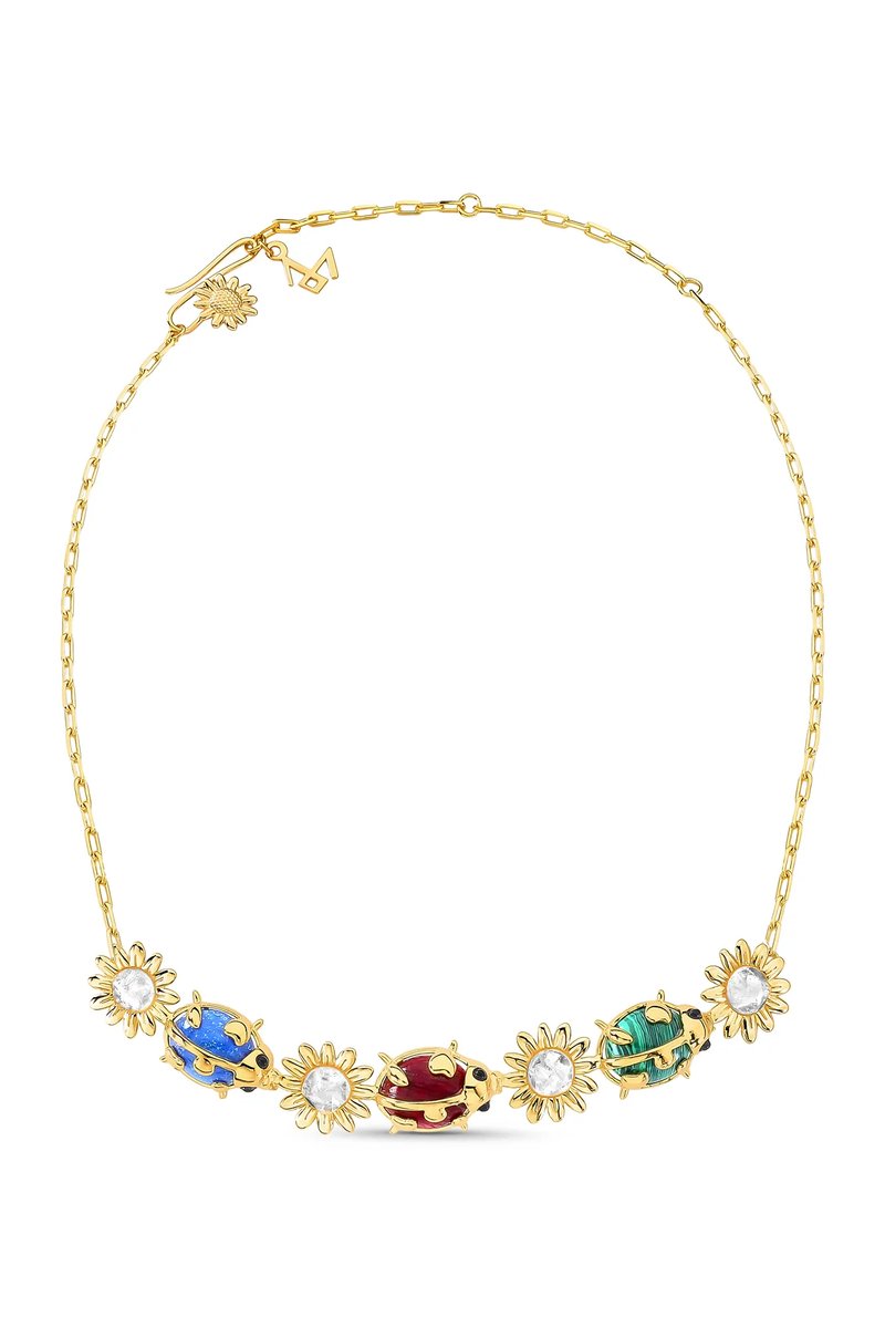 O Colar Jardim Maria Dolores é uma celebração da natureza e de suas energias luminosas. Folheado a Ouro, o modelo apresenta uma composição rica em símbolos: nas laterais, uma corrente de elos retangulares e, ao centro, três joaninhas em metal com pedras, Malaquita, Quartzo Azul Anil e Feldspato Vermelho. Entre elas, delicados girassóis em metal e pedra natural Cristal com lapidação bruta com lapidação bruta refletem a força e a beleza do jardim que inspira a coleção.A peça, um dos grandes destaques da marca, volta agora em uma nova versão, mantendo o encanto e a presença do modelo original, mas com proporções mais leves e delicadas, perfeitas para o uso diário. O extensor permite ajuste de altura, para garantir conforto e um visual sofisticado.Mais do que um colar, é uma joia que irradia alegria, um amuleto de luz que traduz o espírito da coleção Girassol: forte, gentil e sempre voltado para o que faz florescer.