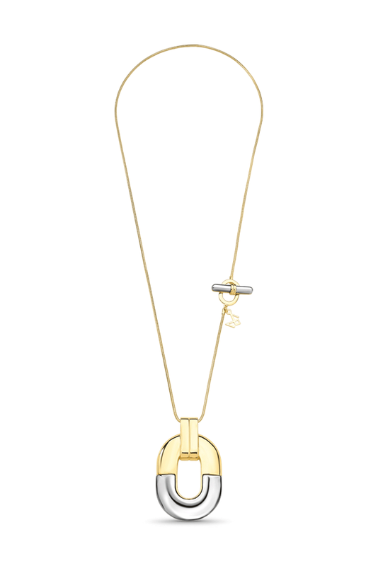 O pingente em formato de elo combina duas matérias em equilíbrio: o metal polido e a pedra Ágata Cinza Metalizada, criando um contraste visual sofisticado entre cor e luminosidade. O desenho alongado do elo valoriza o colo e traz presença sem excesso.