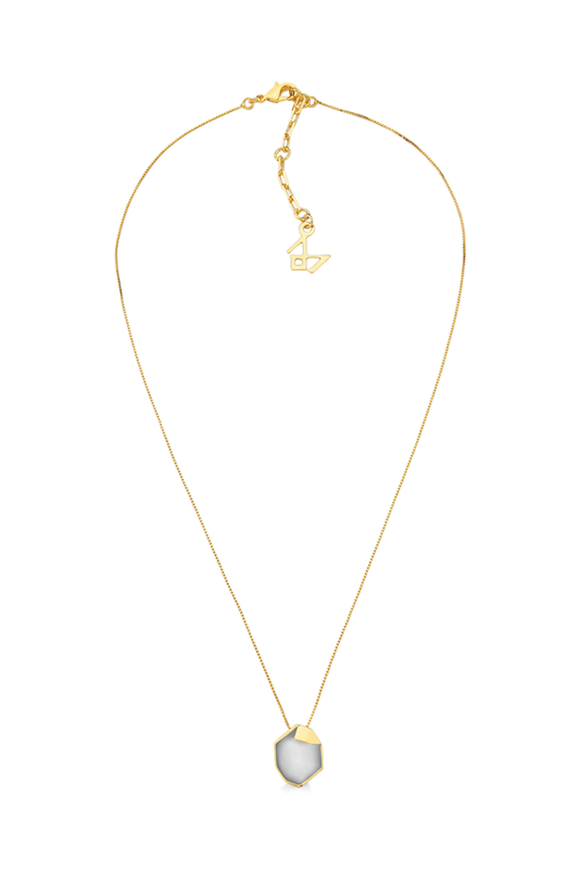 O destaque é o seu pingente em pedra Ágata Cinza Metalizada, com formato irregular e lapidação orgânica. Um detalhe em metal envolve parcialmente a pedra, ultrapassando propositalmente uma de suas extremidades e criando um contraste delicado entre brilho, textura e assimetria.