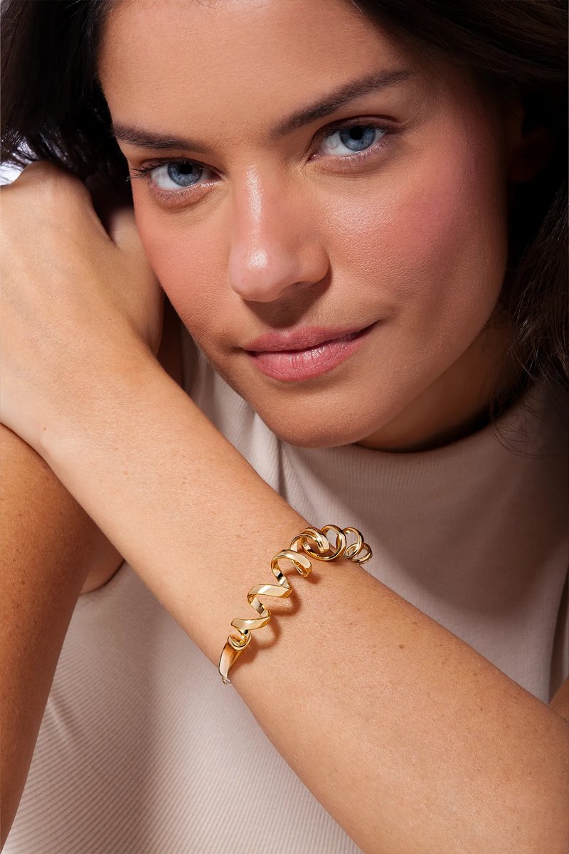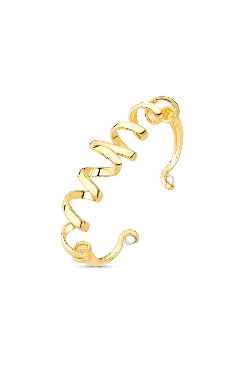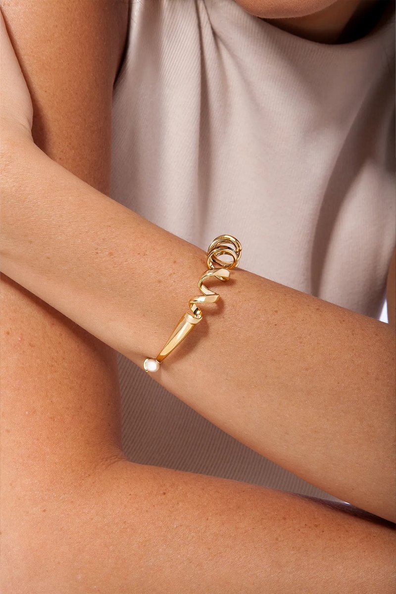 A Pulseira Bracelete Zest Maria Dolores traz para o pulso a mesma espiral orgânica que inspira toda a família Zest. Seu aro se desenrola em curvas fluidas, lembrando o movimento de uma casca de fruta recém-descascada, em um gesto leve e marcante. De uma extremidade a outra, o desenho se completa com duas Pérolas que podem ser usadas discretamente na parte interna ou exibidas como detalhe na frente, em uma proposta versátil e inesperada. O aro maleável permite ajuste ao braço, garantindo conforto com a imponência do design. Um bracelete folheado a Ouro que traduz intensidade e delicadeza em equilíbrio perfeito, iluminando o verão em cada detalhe.