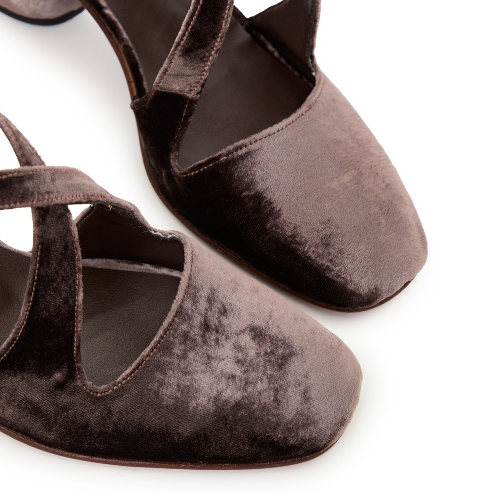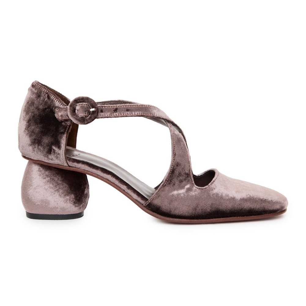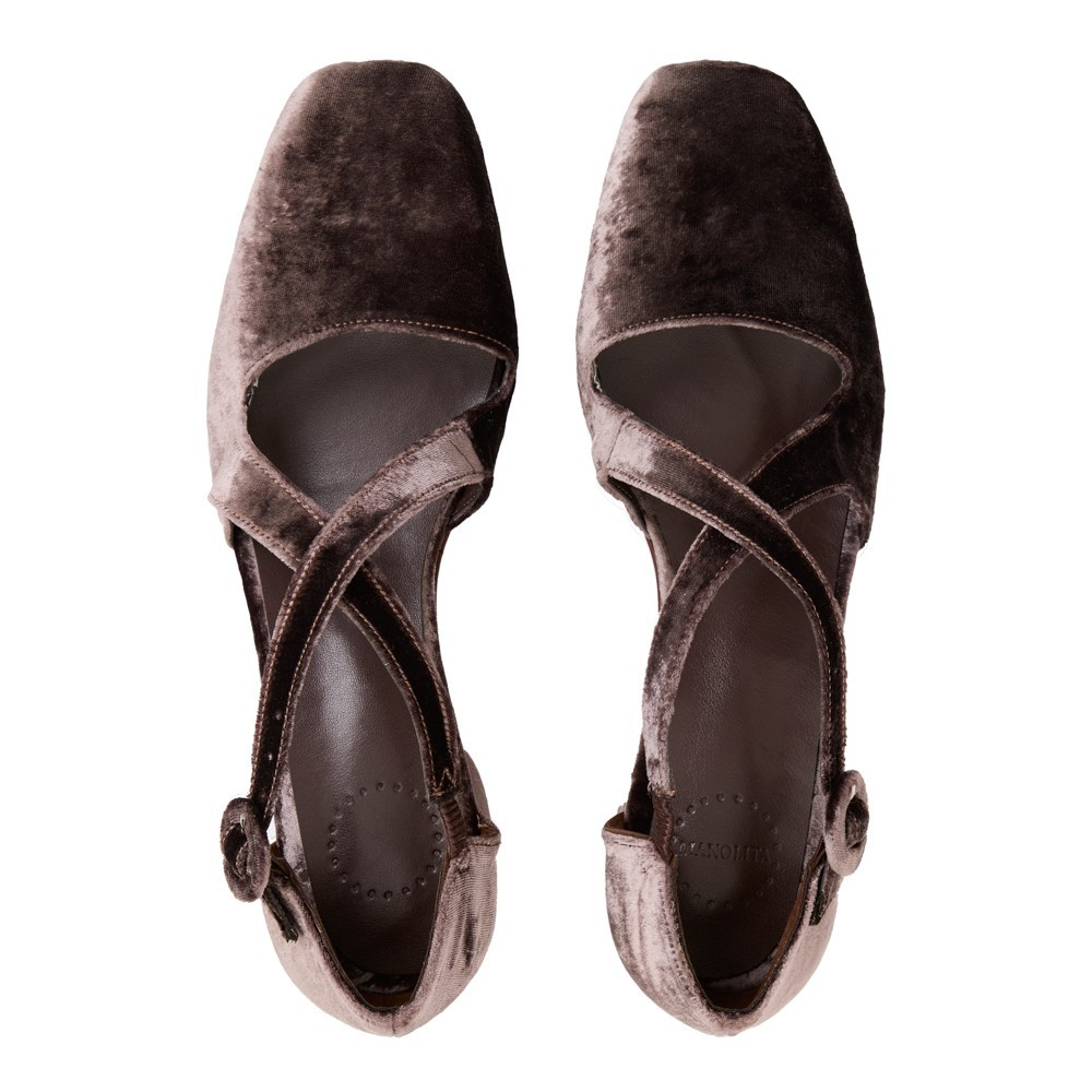 Todo em veludo alemão de seda, tem solado revestido no mesmo veludo, no melhor estilo monocromático.