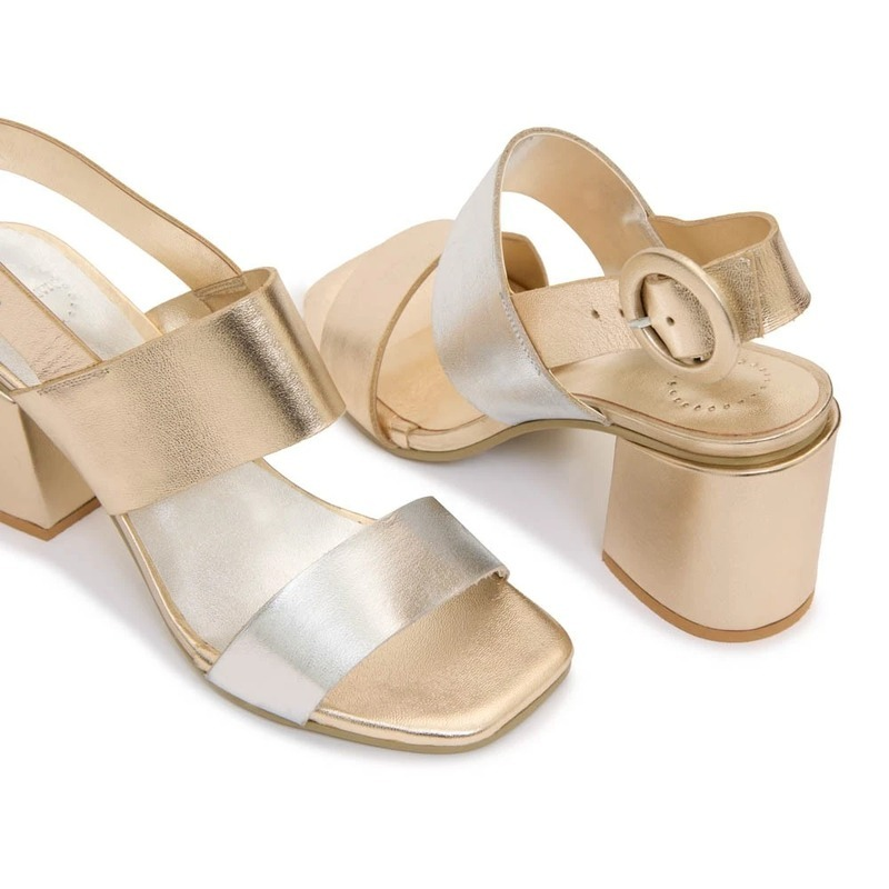 Possui salto bloco de 7,5 cm e fechamento por fivela lateral.